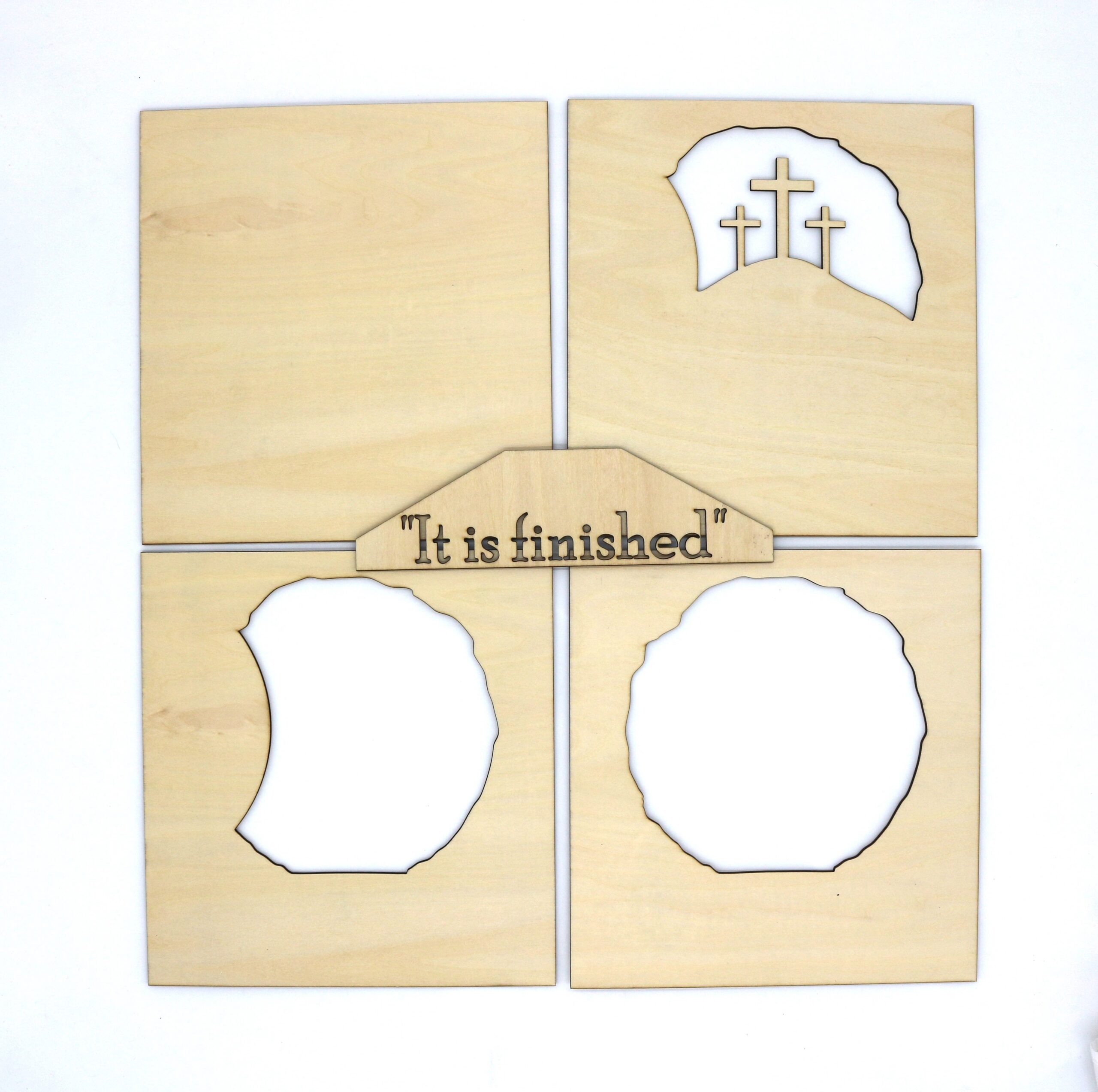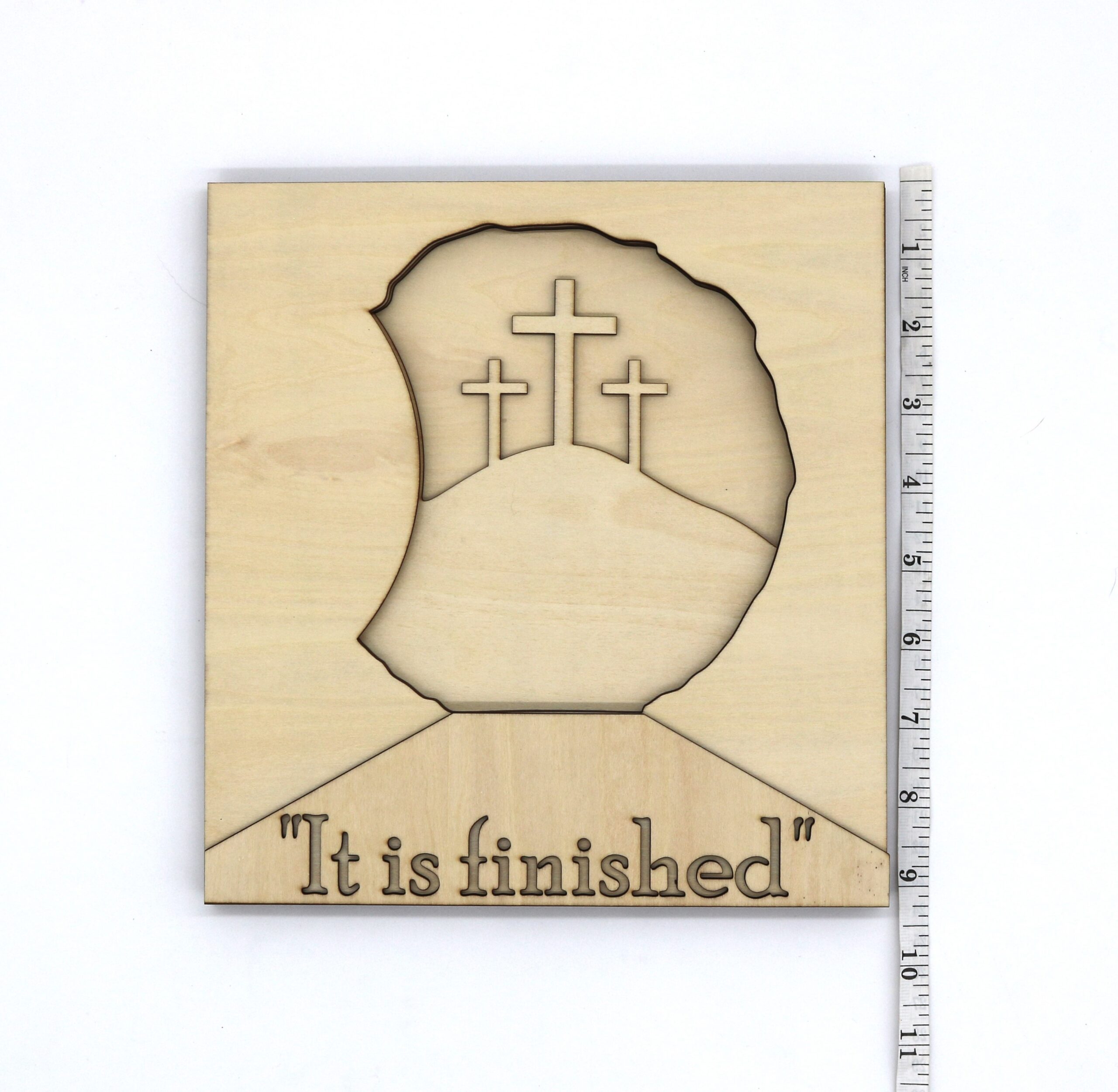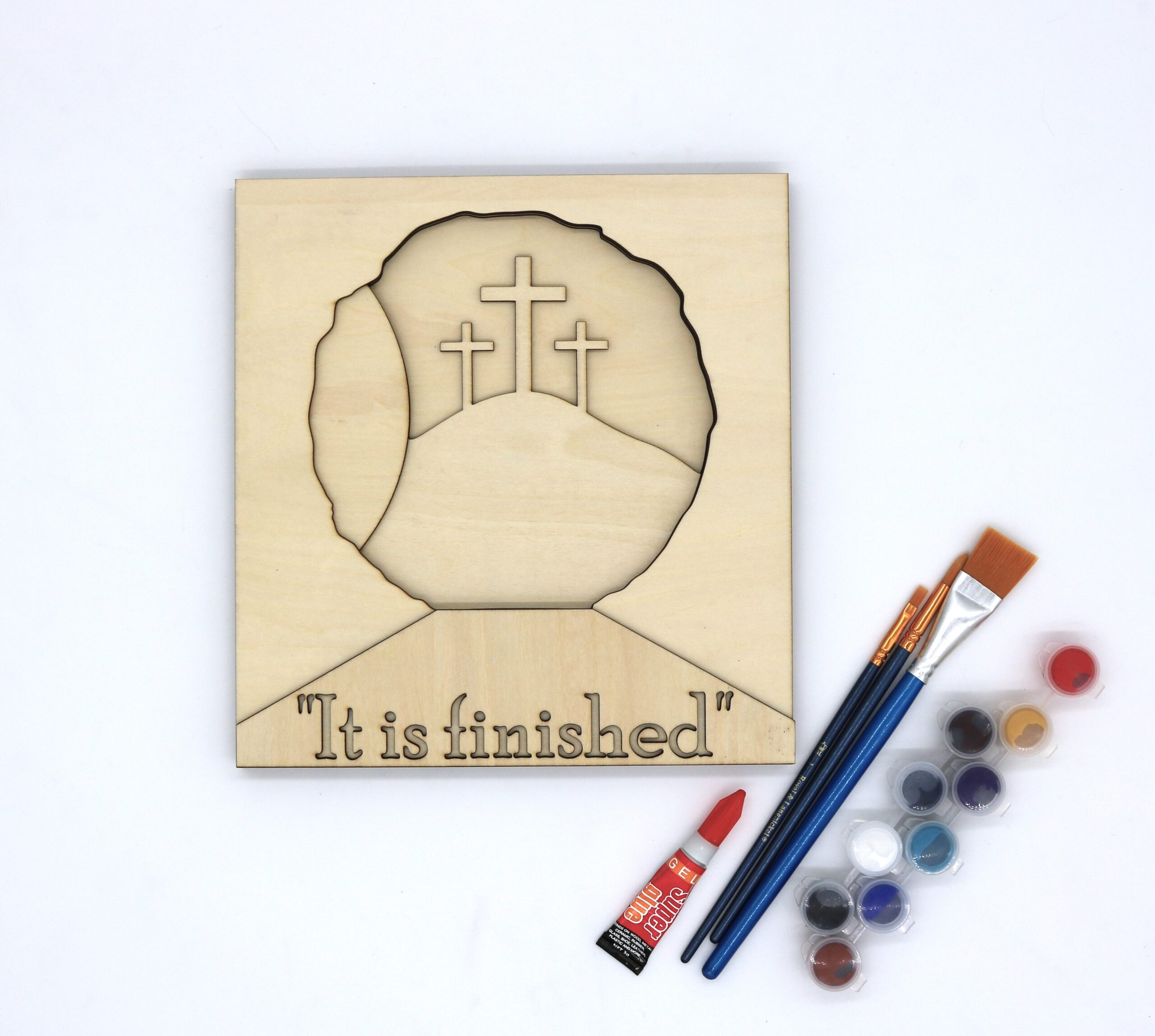 This Kit includes five layers of wood with the top of layer of wood engraved with the words “It is finished.” It also includes acrylic paint, paint brushes and fast drying glue to assemble your project.