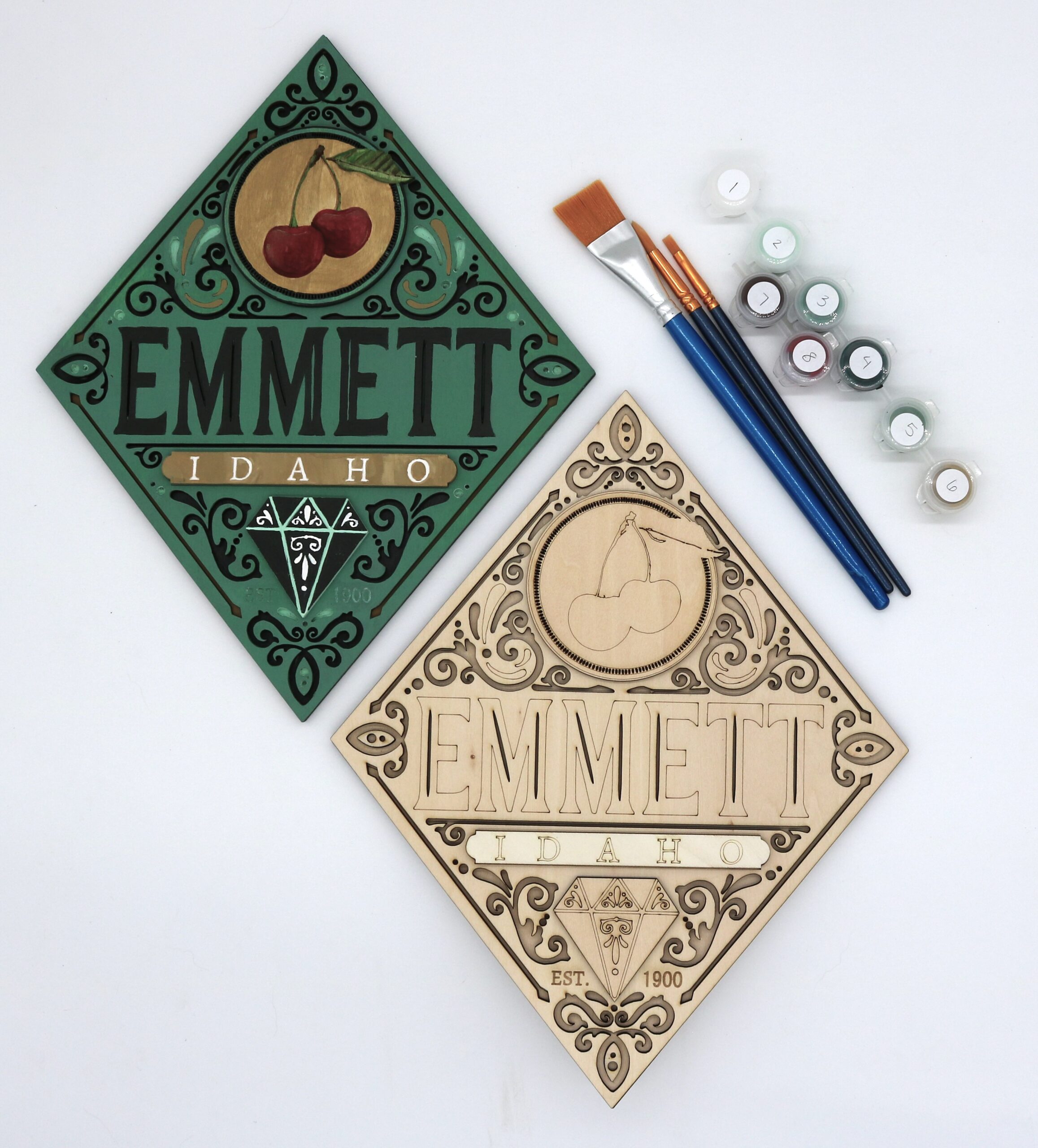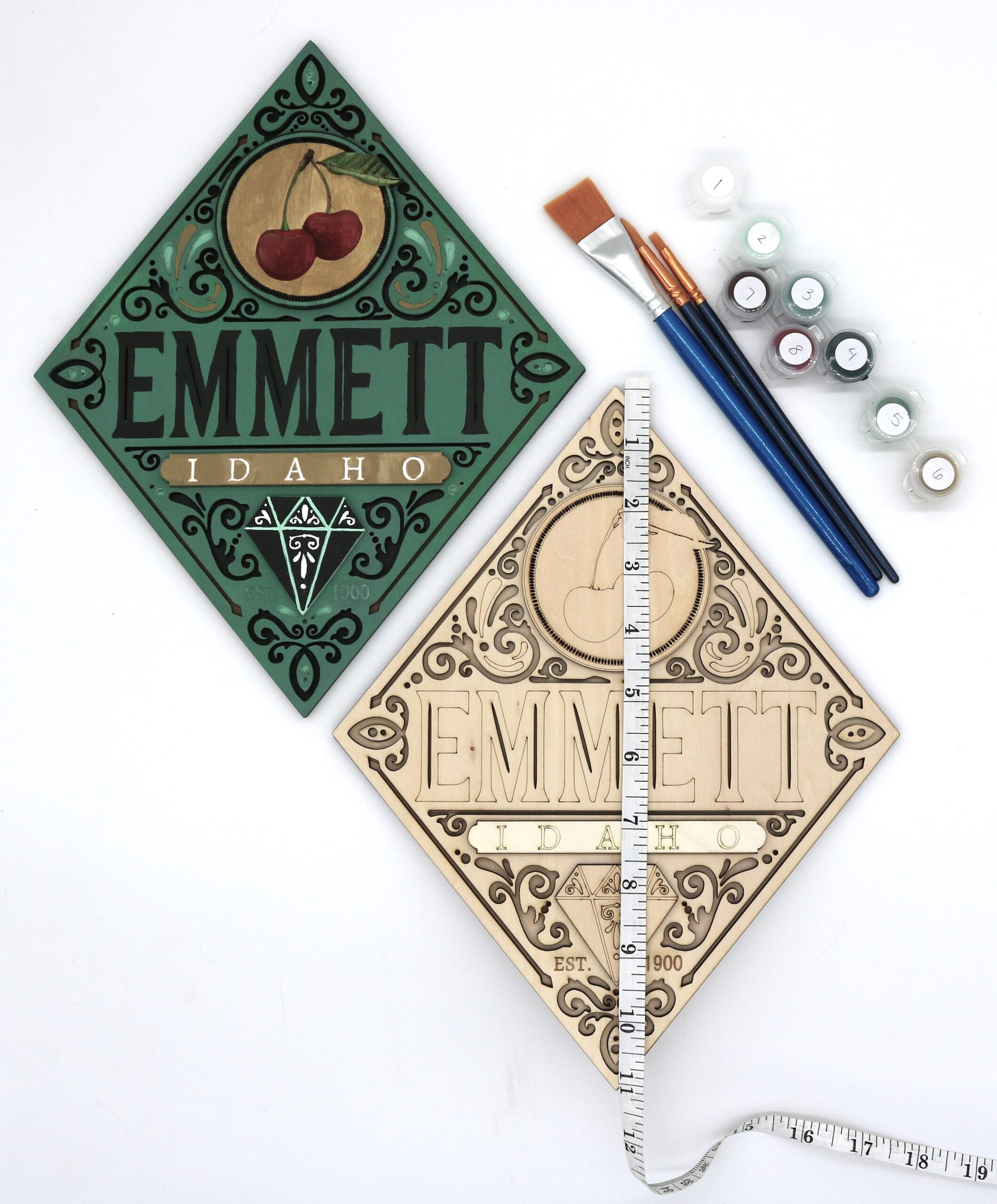 This three layered wood paint kit boasts of beautiful engraved and etched designs throughout the entire piece. These vibrant colors that capture the heart of our small town, Emmett, celebrate its heritage of cherry picking and festival traditions. Follow along our step-by-step instructions and paint this Gem of a beauty, designed by local artist, Kristin with Lamplight Collective. This kit includes water-based, acrylic paints and step-by-step photo directions for each of the four layers. It is easy to paint and fun to put together.